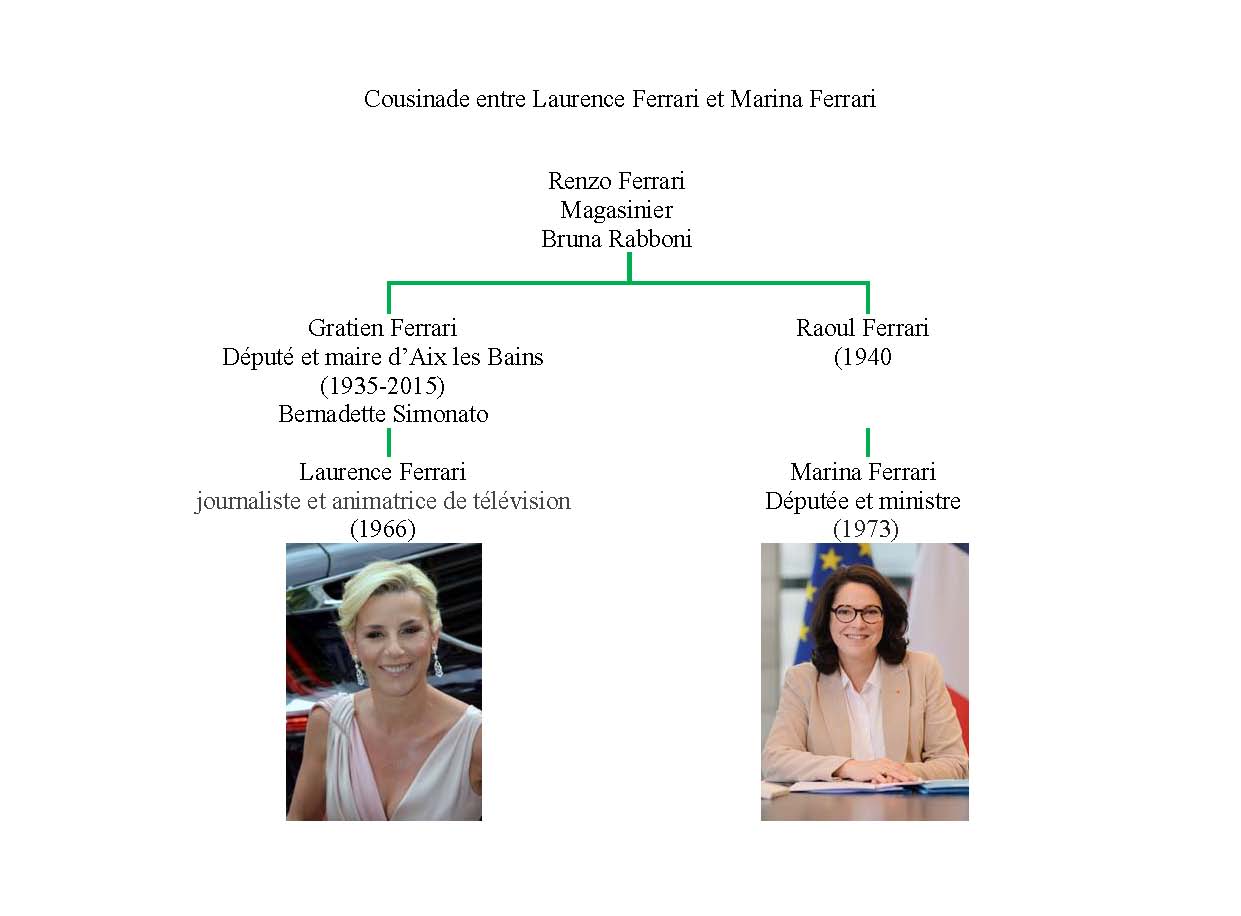Mais au-delà de son parcours politique, un autre détail intrigue : Marina Ferrari est la cousine de la journaliste Laurence Ferrari. Leur lien familial remonte à Renzo Ferrari magasinier, dont Gratien Ferrari, ancien maire d’Aix-les-Bains et député de la circonscription, père de Laurence Ferrari et Raoul Ferrari père de Marina Ferrari.